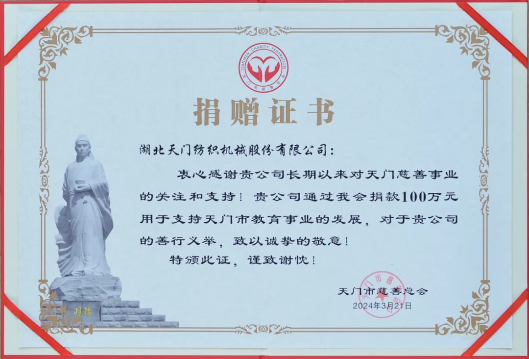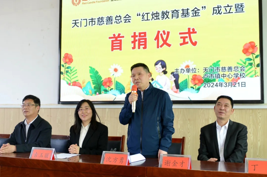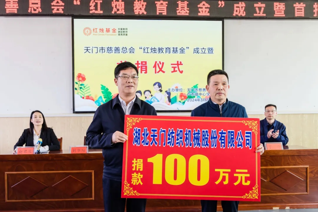 2024年3月21日,天門紡機董事長沈方勇出席在天門市盧市鎮(zhèn)盧家口中學舉行的天門慈善總會“紅燭教育基金”成立暨首捐儀式,同天門市慈善總會、教育局三方簽訂了《天門市慈善總會“紅燭教育基金”協(xié)議書》,并現場捐贈100萬元,用于獎勵盧市鎮(zhèn)優(yōu)秀教師和幫扶困難教師等公益活動,助力盧市鎮(zhèn)教育高質量發(fā)展。天門市人民政府副市長古玉麗,天門市民政局局長、市慈善總會會長謝金才,天門市教育局局長劉華陽,天門市慈善總會秘書長李貴清,盧市鎮(zhèn)宣傳統(tǒng)戰(zhàn)委員劉恒超以及盧市鎮(zhèn)部分教師代表等參加首捐儀式。盧市鎮(zhèn)黨委書記趙君波主持儀式。
