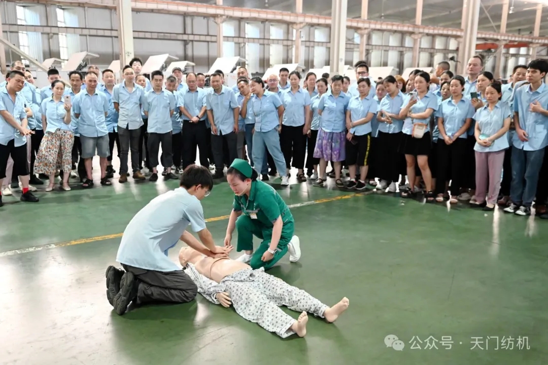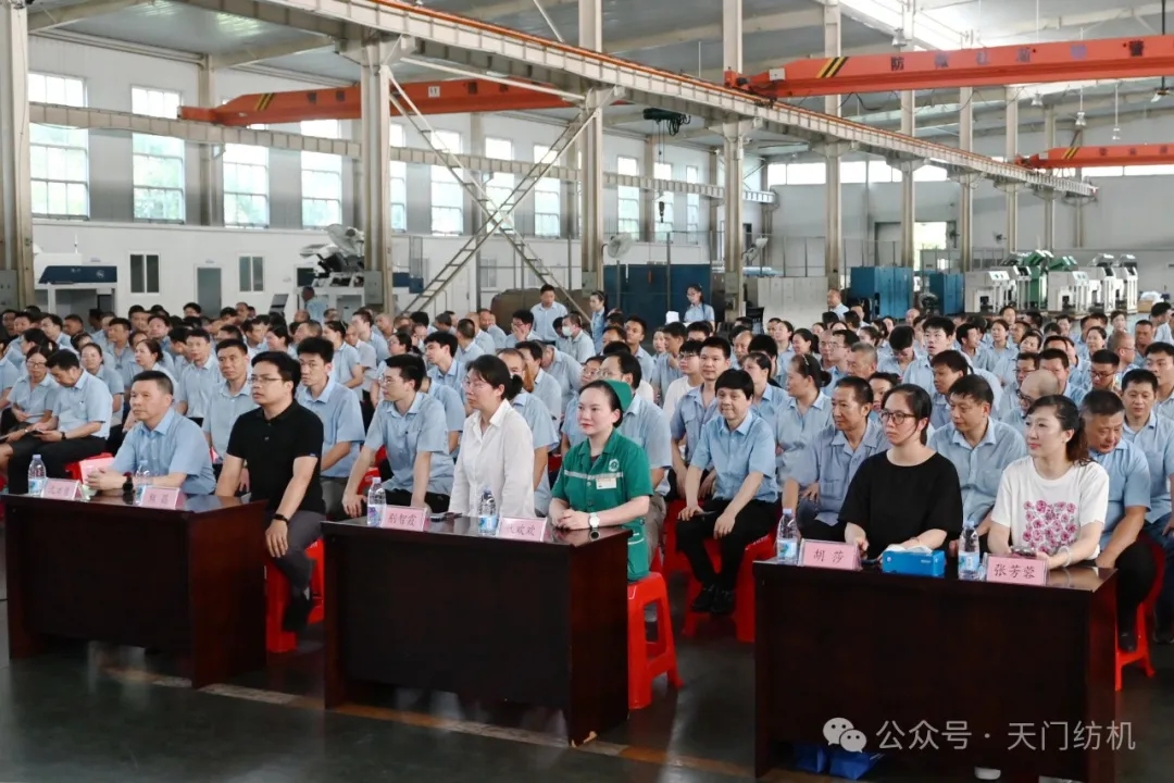 室外赤日炎炎,酷暑難當;室內座無虛席,氣氛熱烈。2024年7月17日下午,天門紡機在生產現場組織了一場別開生面的健康知識及急救技能培訓活動,天門市第一人民醫院的多位醫療專家應邀來公司進行健康知識講座和急救實操演示。